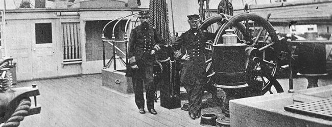 Rear Adm. David G. Farragut (right), commander of the West Gulf Blockading Squadron, stands with Capt. Percival Drayton at the wheel of the squadron flagship, the USS Hartford, in Mobile Bay, Alabama, 1864. (Naval Historical Center)