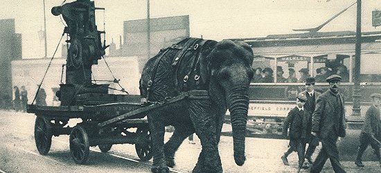 An elephant moves equipment at a munitions plant in Sheffield, England, during World War I.